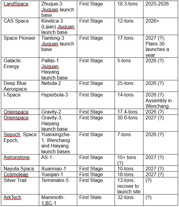 The chart below shows that as of late 2025 there are at least 15 Chinese companies developing at least 18 new reusable launch vehicles.